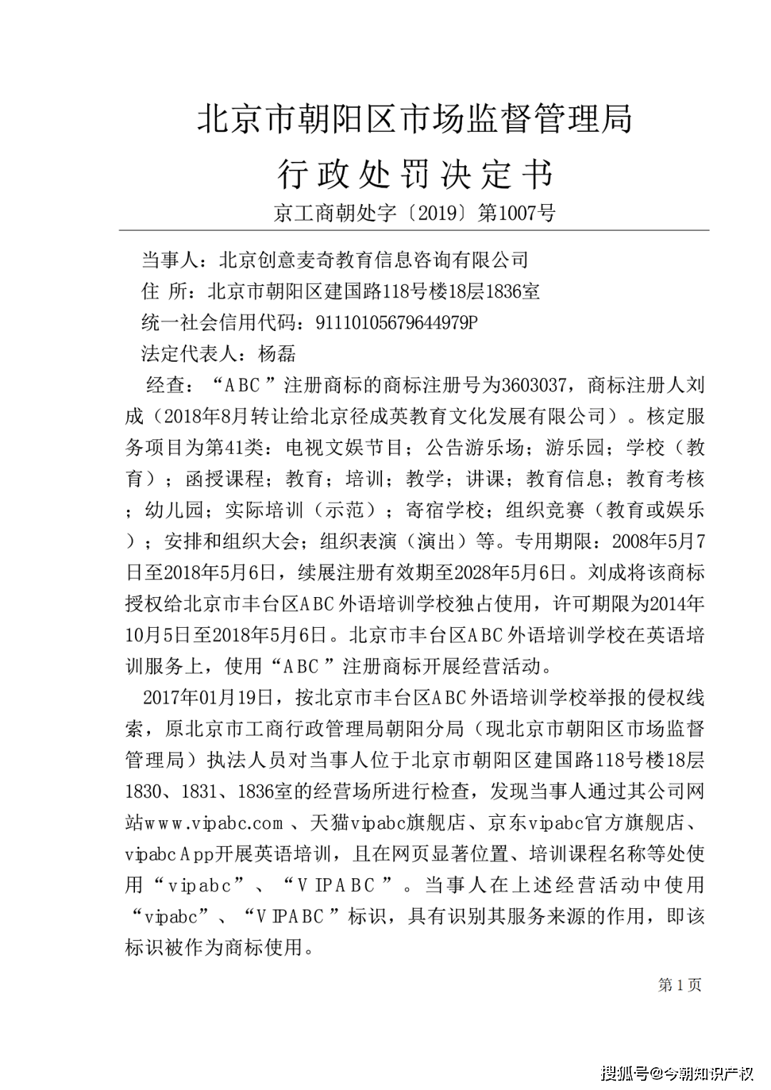 因“VIPABC”侵权“丰台ABC学校”商标,北京创意麦奇佳偶信息咨询有限公司(下称麦奇英语)被北京市朝阳区市场监督管理局(下称朝阳局)处以3100万罚款。为此,麦奇英语将朝阳局及上级单位北京市市场监督管理局起诉至法院,要求撤销行政处罚。该案4月16日在朝阳法院线上开庭。
