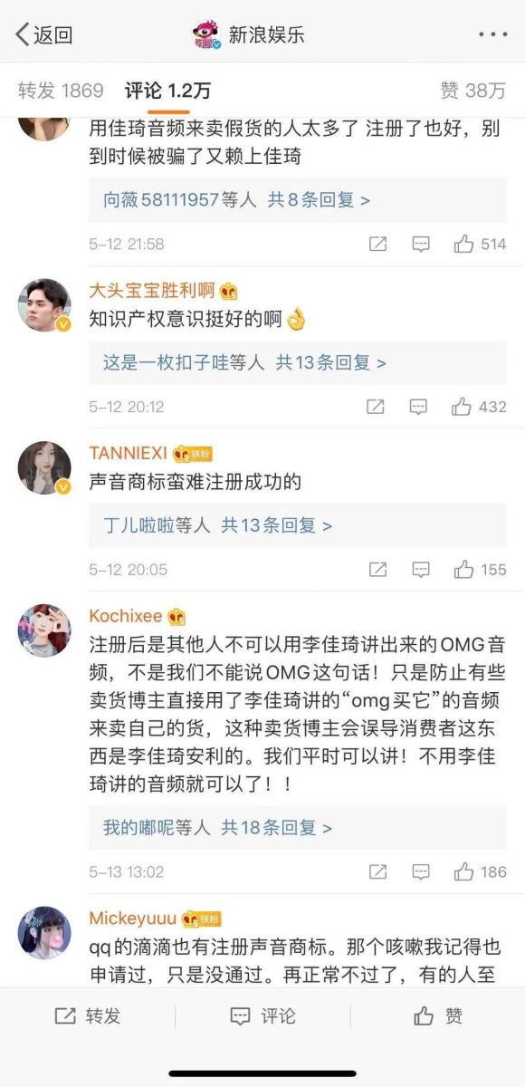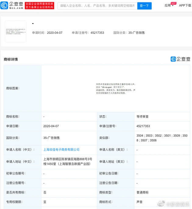 据新浪娱乐官方微博发文,企查查搜索结果显示,2020年4月7日,妆佳公司就李佳琦口头禅“oh my god,买它买它!”提出声音商标注册申请,商标国际分类为35-广告销售,申请注册号为45217353,目前状态为等待审查。对此,李佳琦方面回应称,系保护性注册。“保护性注册”目的为避免某些卖家恶意使用,误导消费者。