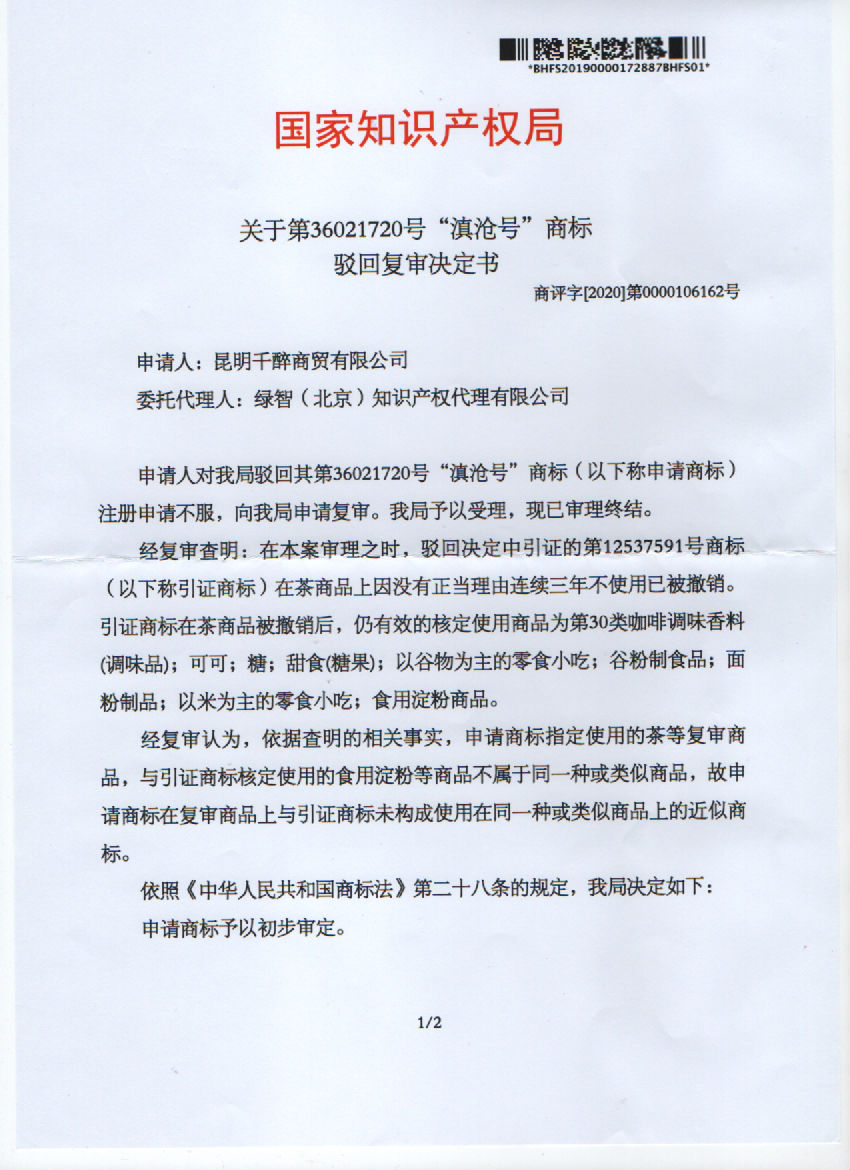 关于第36021720号“滇沧号”商标驳回复审决定书