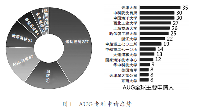 AUG全球专利申请起步于1992年,大致可分为三个阶段:1992年至2005年为萌芽期,2006年至2010年为技术储备期,2011年至今为快速发展期,其中从2013年开始AUG全球专利申请呈现爆发式增长。各国之间技术封锁较为严重,几乎没有同族申请。得益于我国“十二五”和“十三五”规划提出的海洋强国战略,我国AUG专利申请量在近几年增长迅速,全球前15位申请人,除美国海军外,其余多为中国高校院所。AUG相关技术中运动控制系统专利文献相对较多,达到了227篇,是AUG中相对较成熟的技术;组网、水声通信和导航等AUG相关技术因技术难度大、涉及军事应用、保密审查公开较晚等因素影响,目前检索到的专利文献较少。(见图1)