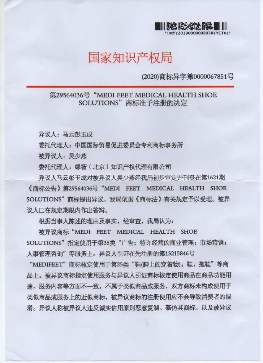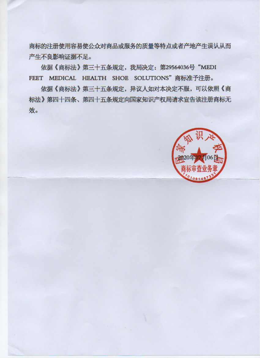 第29564036号“MEDI FEET MEDICAL HEALTH SHOE SOLUTIONS”商标准予注册的决定