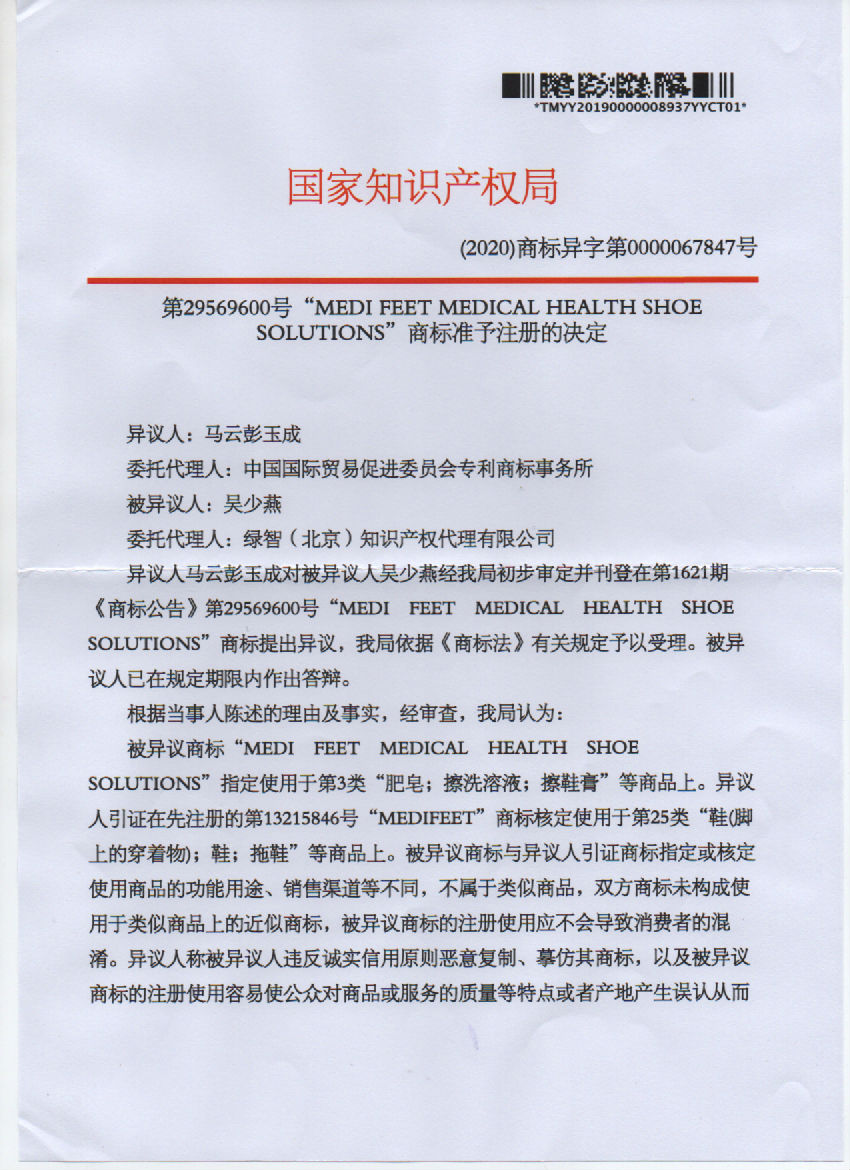 第29569600号“MEDI FEET MEDICAL HEALTH SHOE SOLUTIONS"商标准予注册的决定
