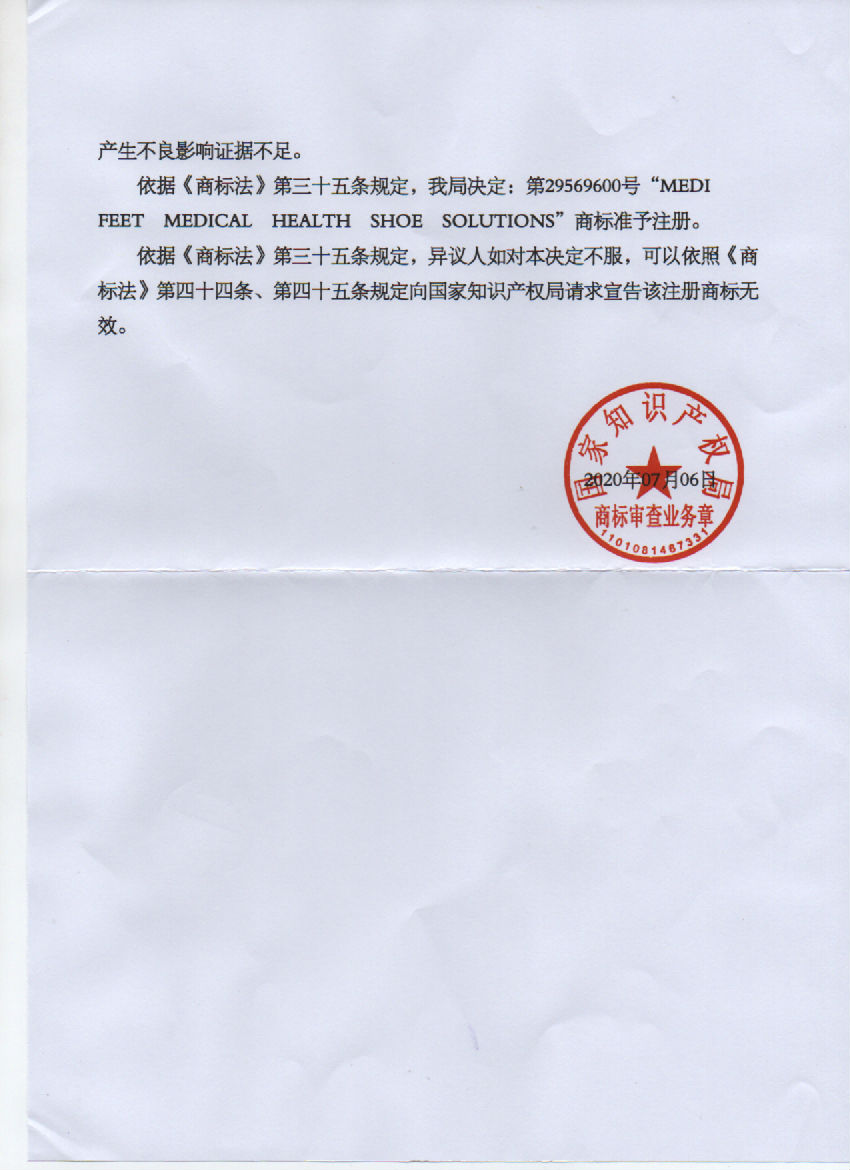 下一篇:第29577524号“MEDI FEET MEDICAL HEALTH SHOE SOLUTIONS"商标准予注册的决定