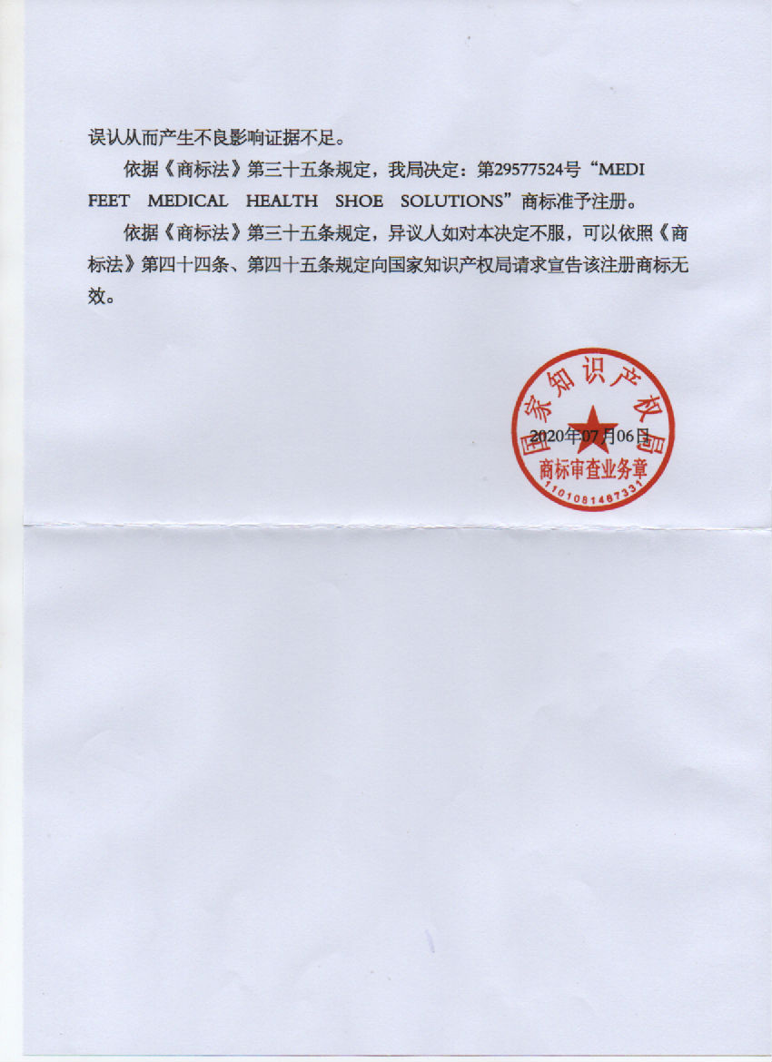 第29577524号“MEDI FEET MEDICAL HEALTH SHOE SOLUTIONS"商标准予注册的决定
