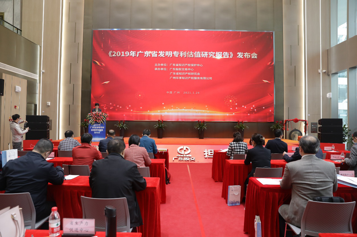 《2019年广东省发明专利估值研究报告》发布会由广东省知识产权保护中心主办,广东股权交易中心、广东省知识产权研究会、广州华享知识产权服务有限公司共同承办。