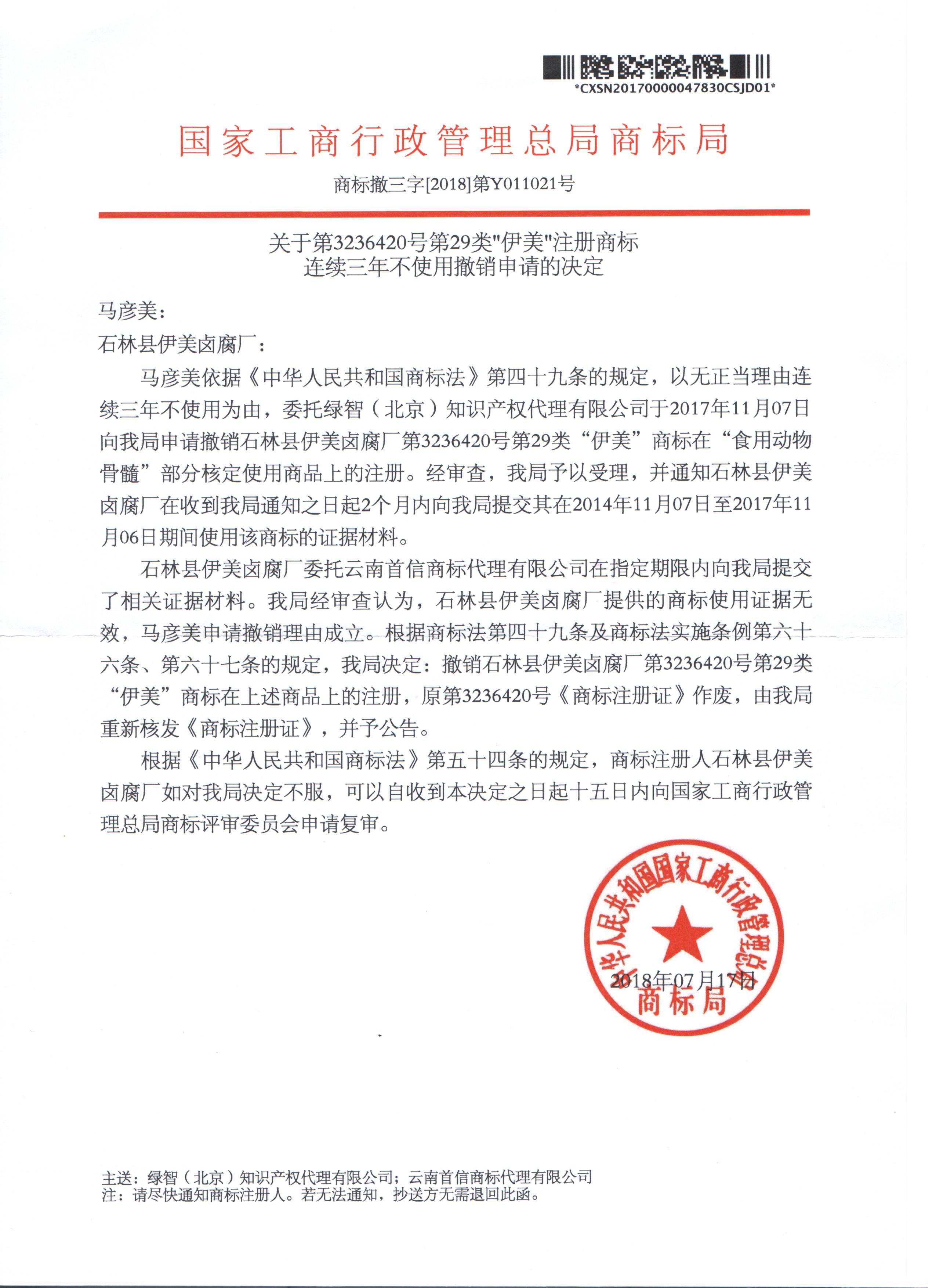 恭喜标视界,为马彦美经理成功撤销石林县伊美卤腐厂的伊美商标