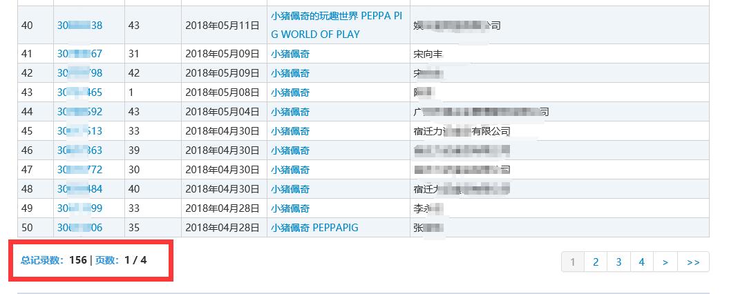 总计156件“小猪佩奇”商标注册记录。