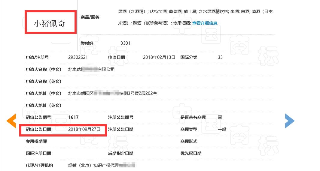 果然,果断的抉择会成就一个品牌。我们的客户顺利拿下小猪佩奇的白酒类商标。在我们客户之后,同类别申请的有六家之多,皆因盲期驳回。所以商标注册要趁早。