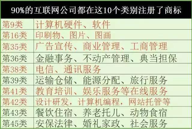 一般来说,90%的互联网公司注册的类别有10个,涉及到互联网公司核心业务的类别主要是:第9类、第16类、第35类、第38类、第41类及第42类商标。