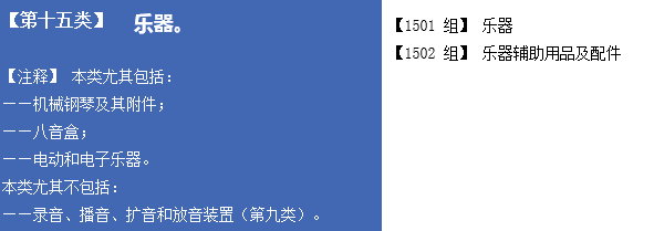 校音扳头150002,乐器琴弓150004,乐器琴弓螺帽150005,弦乐器用弓柄150006,弓用马毛(乐器用)150007,指挥棒150009,鼓槌150010,乐器用肠线150015,定音鼓架150020,乐器弦轴150021,乐器键盘150024,乐器弦150028,音叉150033,吹奏乐器的管口150034,乐器盒150035,竖琴弦150042,机械钢琴用音量调节器150045,拨弦片150048,小提琴腮托150050,音乐盒150052,活页乐谱翻页器150053,琴码150054,鼓面150059,鼓皮150059,乐器用踏板150060,钢琴键盘150061,钢琴弦150062,钢琴键150063,乐器风管150064,乐器用弱音器150065,乐器栓塞150073,乐器音键150077,乐谱纸卷(钢琴)150078,穿孔乐谱纸卷150079,乐谱架150080,乐器架150088,弦乐器用松香150093