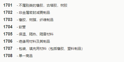 第十七类主要包括电绝缘、隔热或隔音材料,以及生产用塑料片、板或杆,和由橡胶、古塔胶、树胶、石棉、云母及这些材料的替代品制成的某些制品。