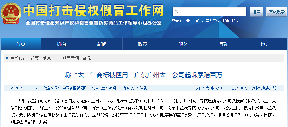 因认为对方未经授权许可使用“太二”商标,广州太二餐饮连锁有限公司以侵害商标权及不正当竞争纠纷为由将广西桂太二餐饮管理有限公司、南宁市金沃餐饮服务有限公司桂林分公司、南宁市金沃餐饮服务有限公司、北京三快科技有限公司诉至法院,要求四被告停止侵权及不正当竞争行为,立即销毁、拆除带有“太二”相同或相近字样的宣传资料、广告招牌,赔偿经济损失100万元等。日前,海淀法院受理了此案。 原告广州太二公司诉称,广州九毛九餐饮连锁股份有限公司于2016年向商标局提出“太二”商标注册申请,经核准,商标专用期限为2017年5月28日至2027年5月27日,后经商标转让,广州太二公司受让取得该商标。商标核定使用在第43类住所代理(旅馆、供膳寄宿处);食物雕刻;餐厅等服务上。2015年7月,首家“太二”餐馆开业,至今在全国拥有近七十家门店。原告公司市场工作人员经调查发现,广西桂太二餐饮公司未经原告合法授权,在经营的餐饮领域大量使用与原告上述注册商标相同、近似的字样,通过直营、招商加盟开设店铺多达十余家,并在北京三快公司运营的“美团网”进行销售。2019年1月16日,原告代理人在位于桂林市穿山东路南宁金沃餐饮公司桂林分公司经营的桂太二老坛酸菜鱼(高新万达店)进行了消费,公证处工作人员进入了解情况、查看、拍照,经查门头、店招、室内装潢、室内用品以及对外宣传等过程中均突出使用“太二”等相关字样。 原告广州太二公司认为,南宁金沃餐饮公司桂林分公司的行为侵害了其商标专用权,亦构成不正当竞争。鉴于原告在餐饮等领域具有知名度,广西桂太二餐饮公司、南宁金沃餐饮公司桂林分公司、南宁金沃餐饮公司、北京三快公司擅自使用“太二”等相关标识,使相关公众误认为被告提供的服务系由原告提供,挤占原告的商业市场,并以此获得了高额的收益,其侵权行为具有非常高的主观恶性,同时具有明显的不正当竞争性,给原告带来了非常巨大的经济损失。 目前,本案正在进一步审理中。 标视界 小课堂: 商标转让流程 1.平台主体公司的企业资质,比如公司的营业执照,可以通过国家公共工商系统进行查询。 2.平台是否通过工信部ICP备案,国家有要求,在国内经营的网站必须通过工信部ICP备案。 3.平台主体是否在国家商标总局进行了代理机构备案,这意味着平台是否有办理商标转让相关业务的资格。 4.平台的交流流程是否安全,比如是否签订商标转让合同,商标资金如何支付等。 5.平台的口碑是否良好,可以通过相关的搜索引擎进行查询。 6. 平台所上架的商标产品价格是否靠谱,是否明码标价,建议客户可以多进行对比。
