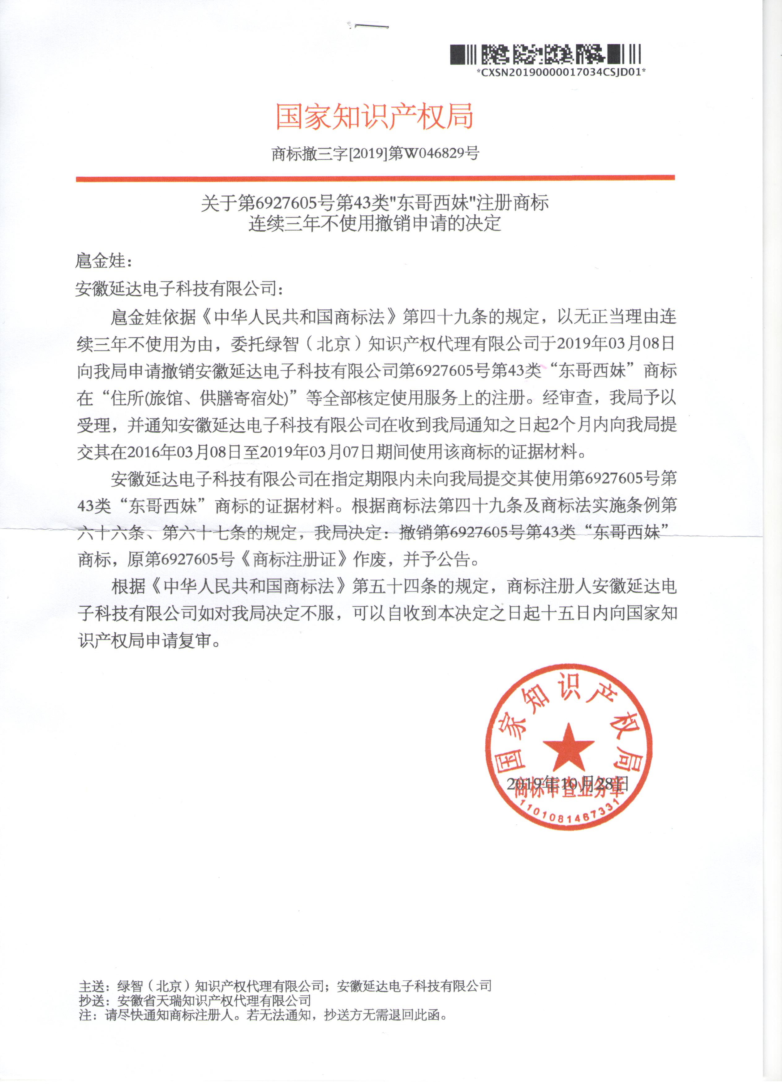 恭喜绿智知识产权成功撤销“东哥西妹”商标(安徽延达电子科技有限公司)