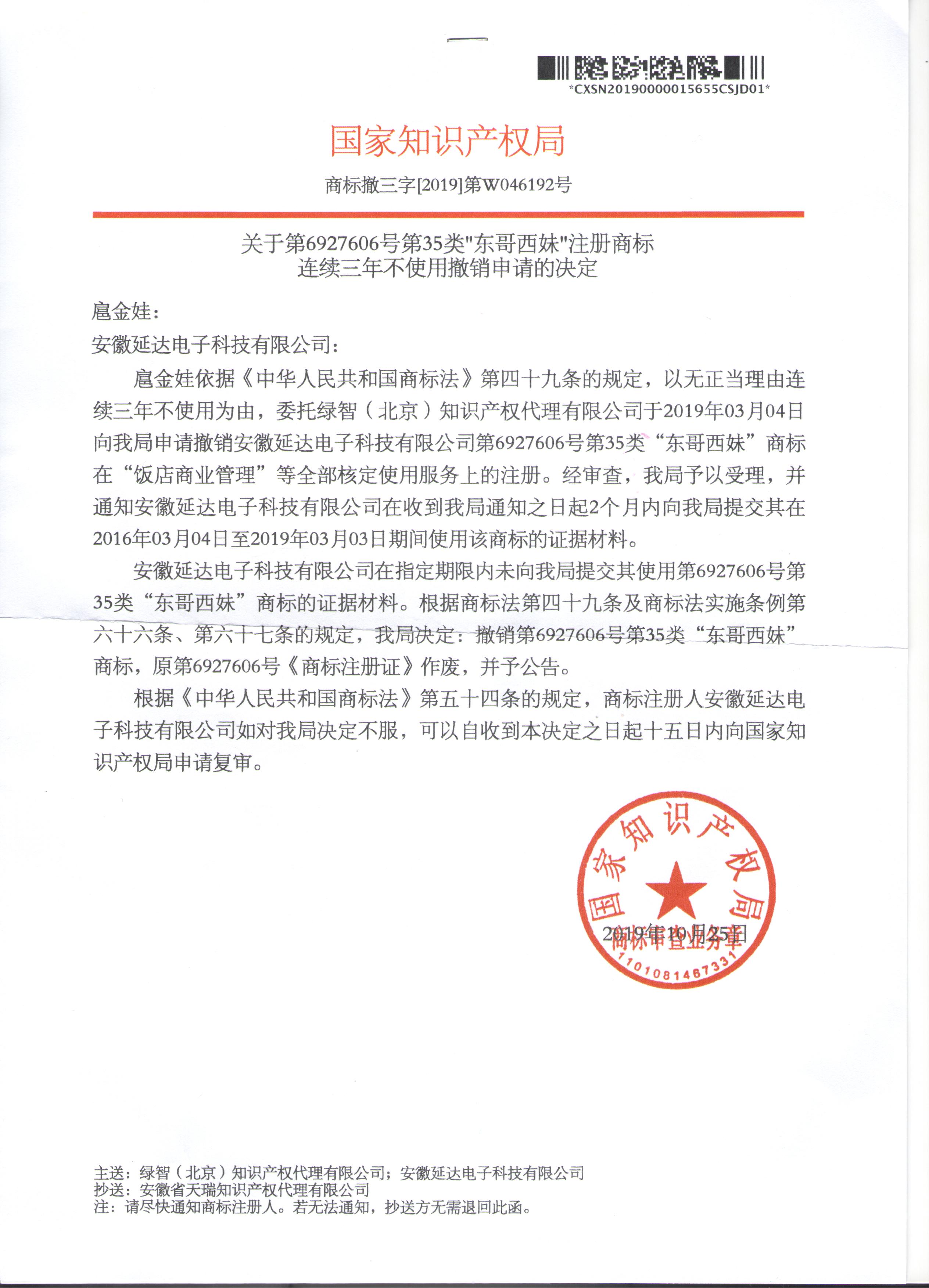 恭喜绿智知识产权成功撤销“东哥西妹”商标(安徽延达电子科技有限公司)