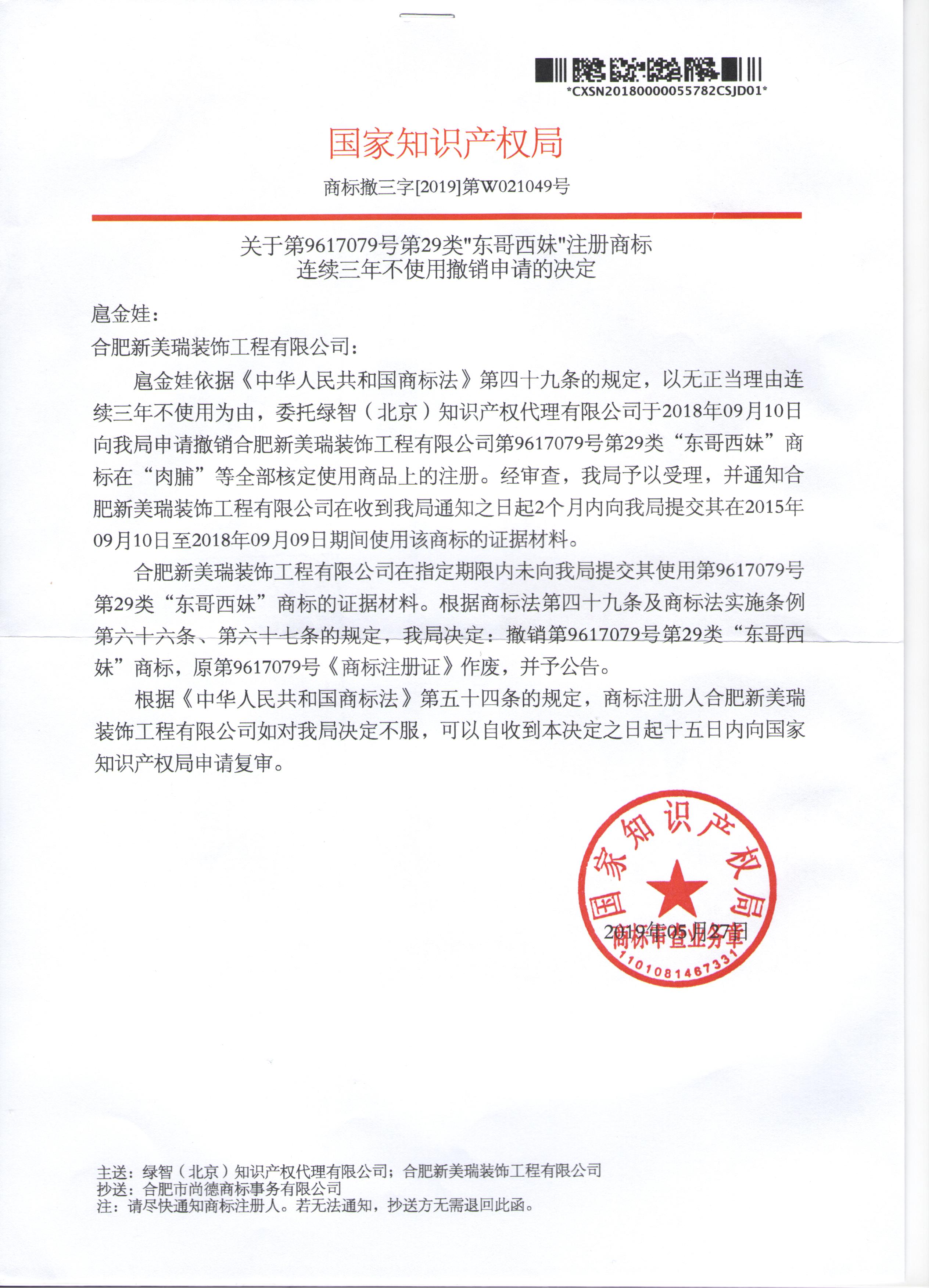 恭喜绿智知识产权成功撤销“东哥西妹”商标(合肥新美瑞装饰工程有限公司)