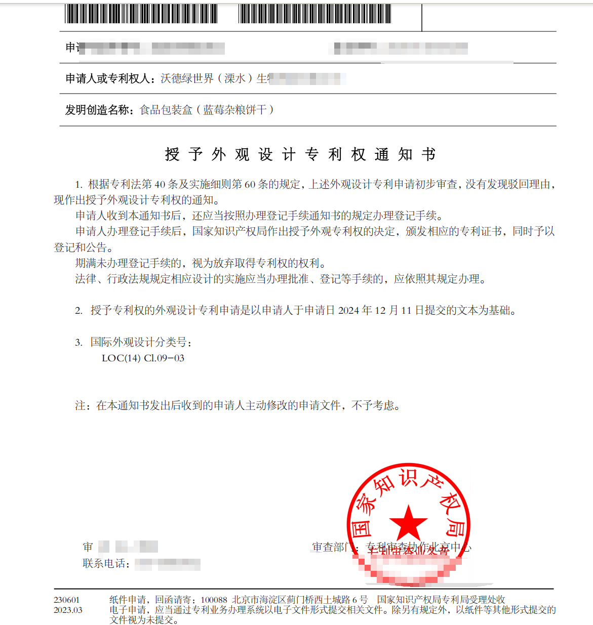 沃德绿世界 “食品包装盒(蓝莓杂粮饼干)” 外观设计专利(申请号:202430786618.X)获批!在零食红海,包装颜值 = 消费决策键 + 侵权防火墙:借蓝莓元素、杂粮纹理的设计巧思,精准击中健康零食视觉需求;凭专利壁垒,让竞品 “抄无可抄”,为品牌筑 “视觉护城河”!